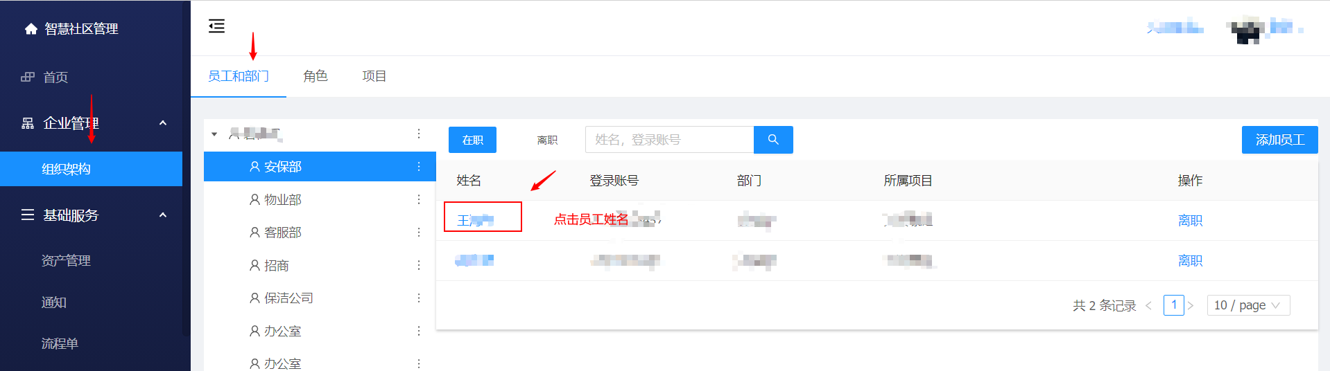 组织架构 -> 员工和部门 -> 点击员工姓名 -> 输入要修改的 员工姓名 、 登录账号 、所属部门、项目、联系电话、E-Mail、备注 并保存