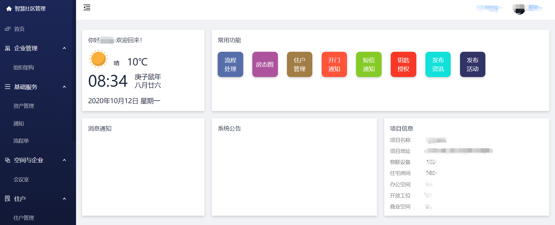 进入管理后台后,可以在首页中查看项目概览信息,以及常用功能入口