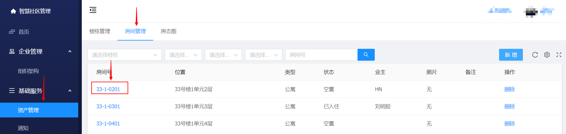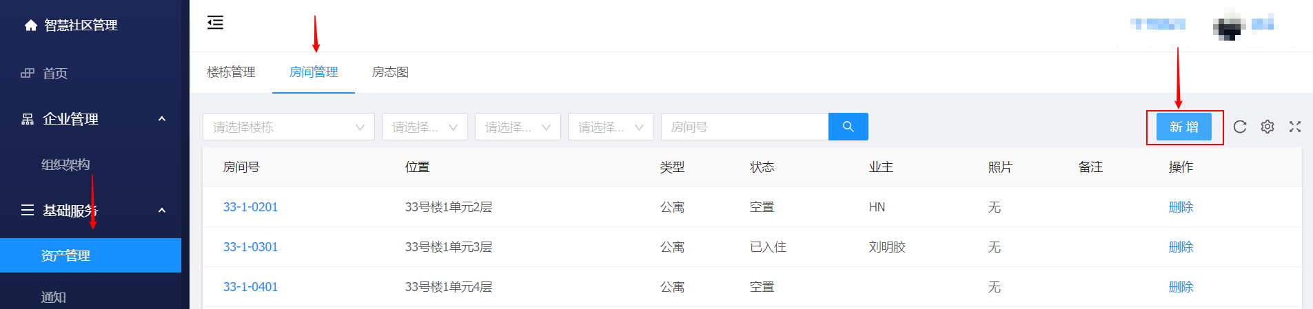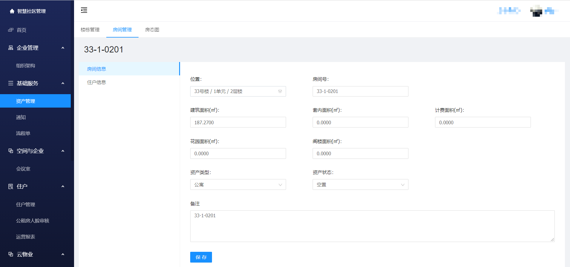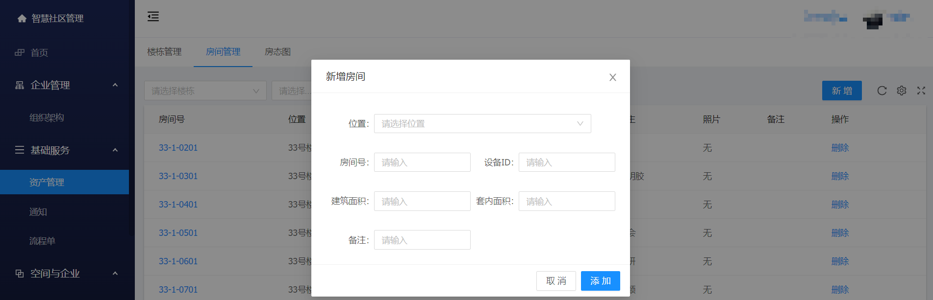 新增:资产管理 ->房间管理 -> 新增 -> 输入 位置、房间号、设备ID、建筑面积、套内面积、备注并保存
