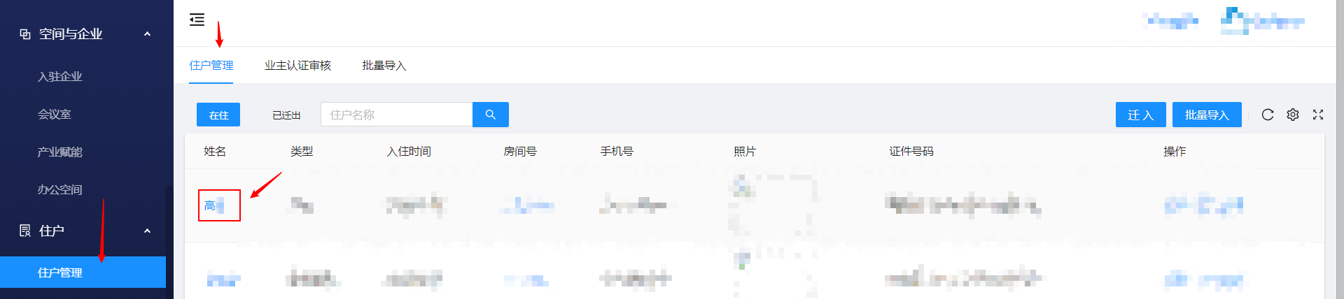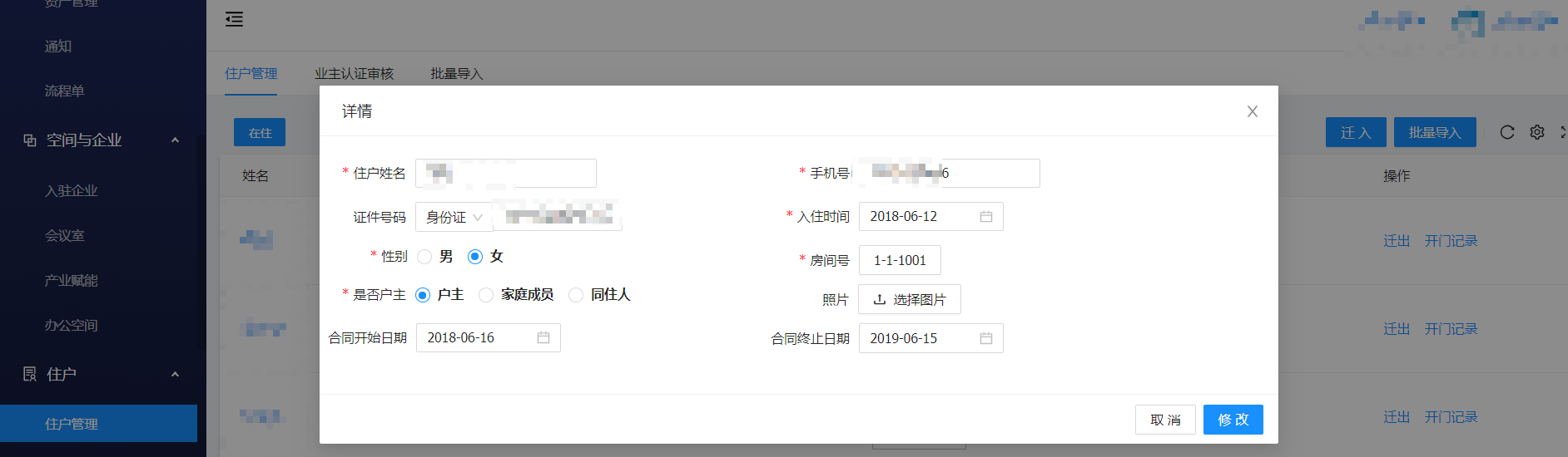 住户管理 -> 住户管理 -> 点击住户名称