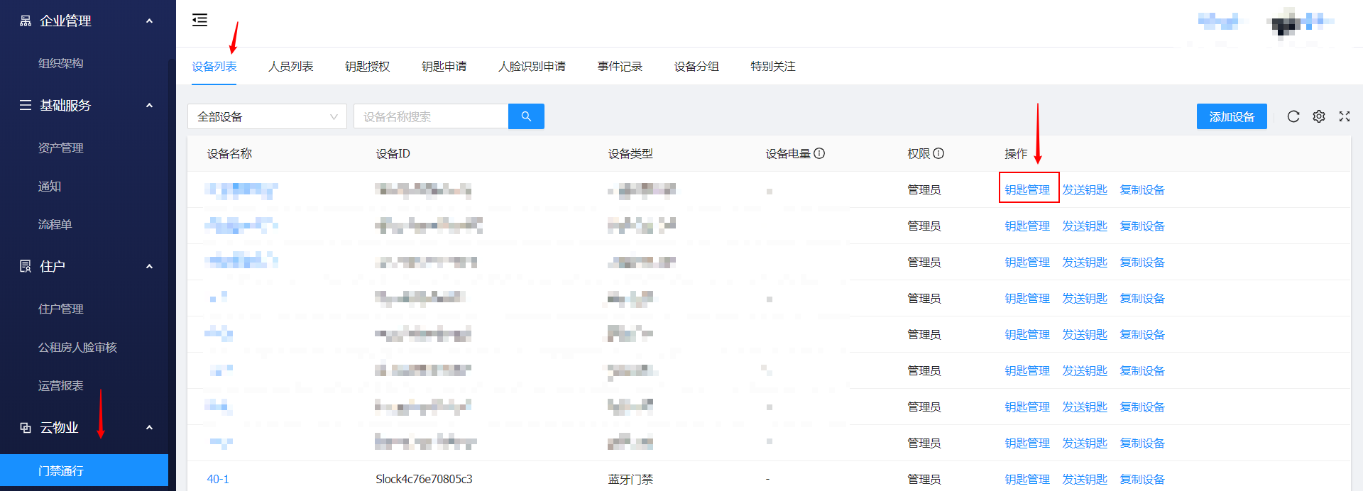 云物业 -> 门禁通行 -> 设备列表