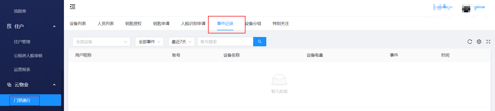 物业管理 -> 门禁通行 -> 事件记录